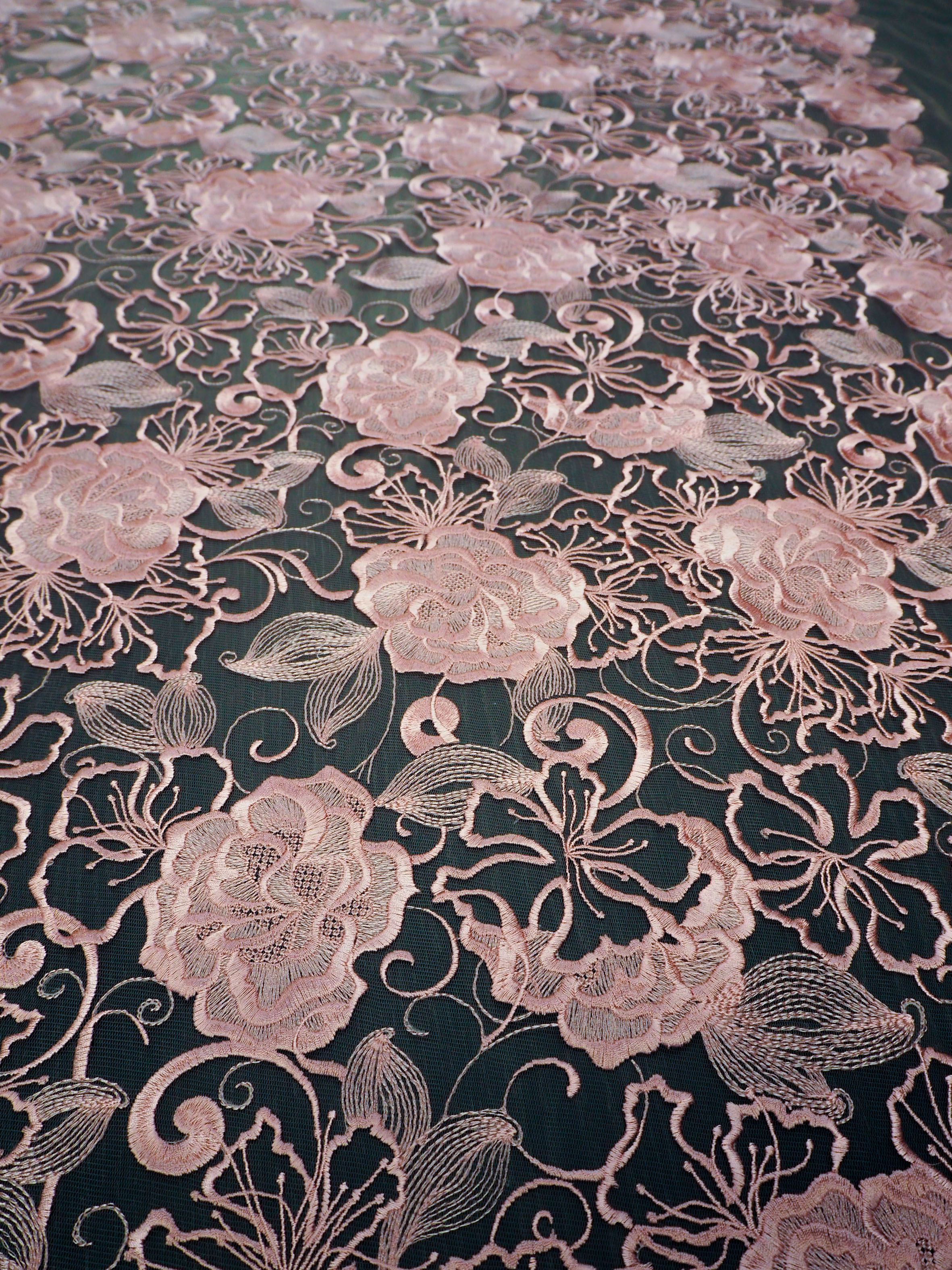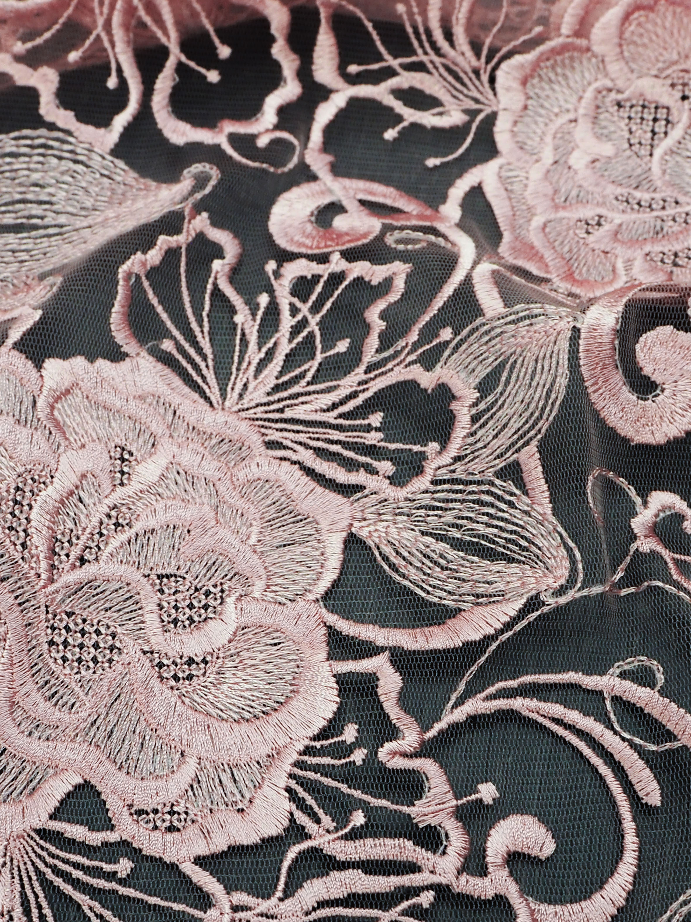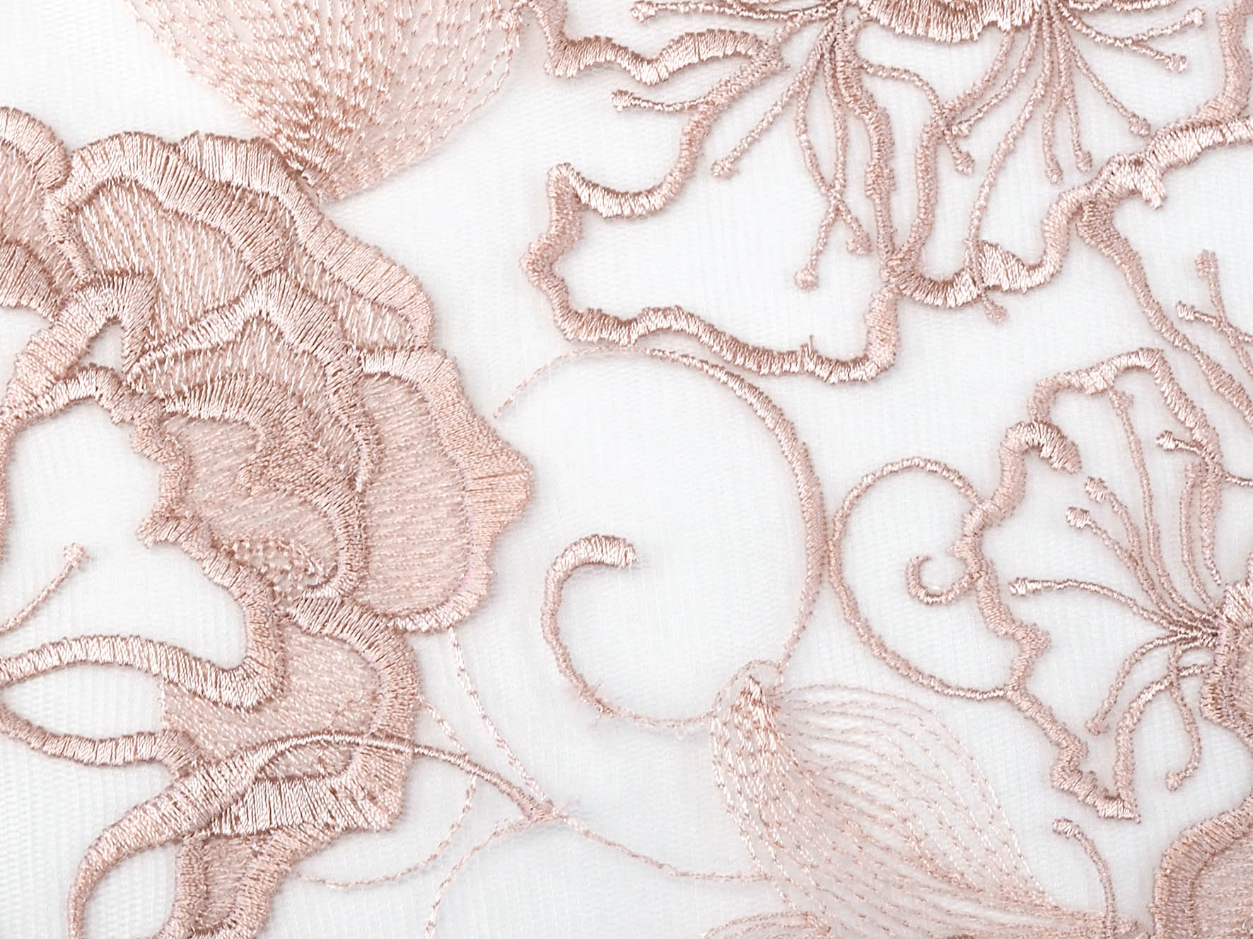 Embroidey tulle ground. Embroidered large rose and hibiscus flower with swirl details. Allover. Width 125cm