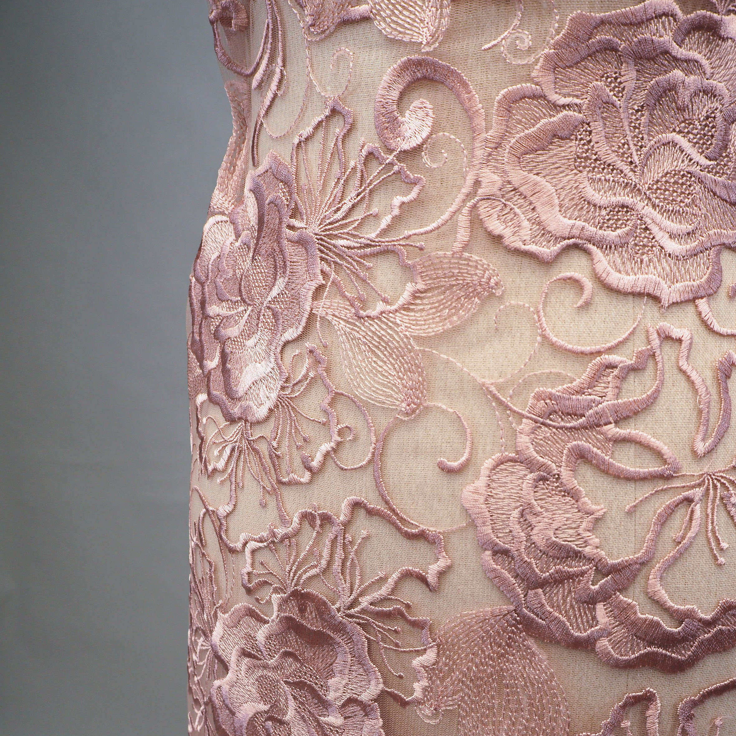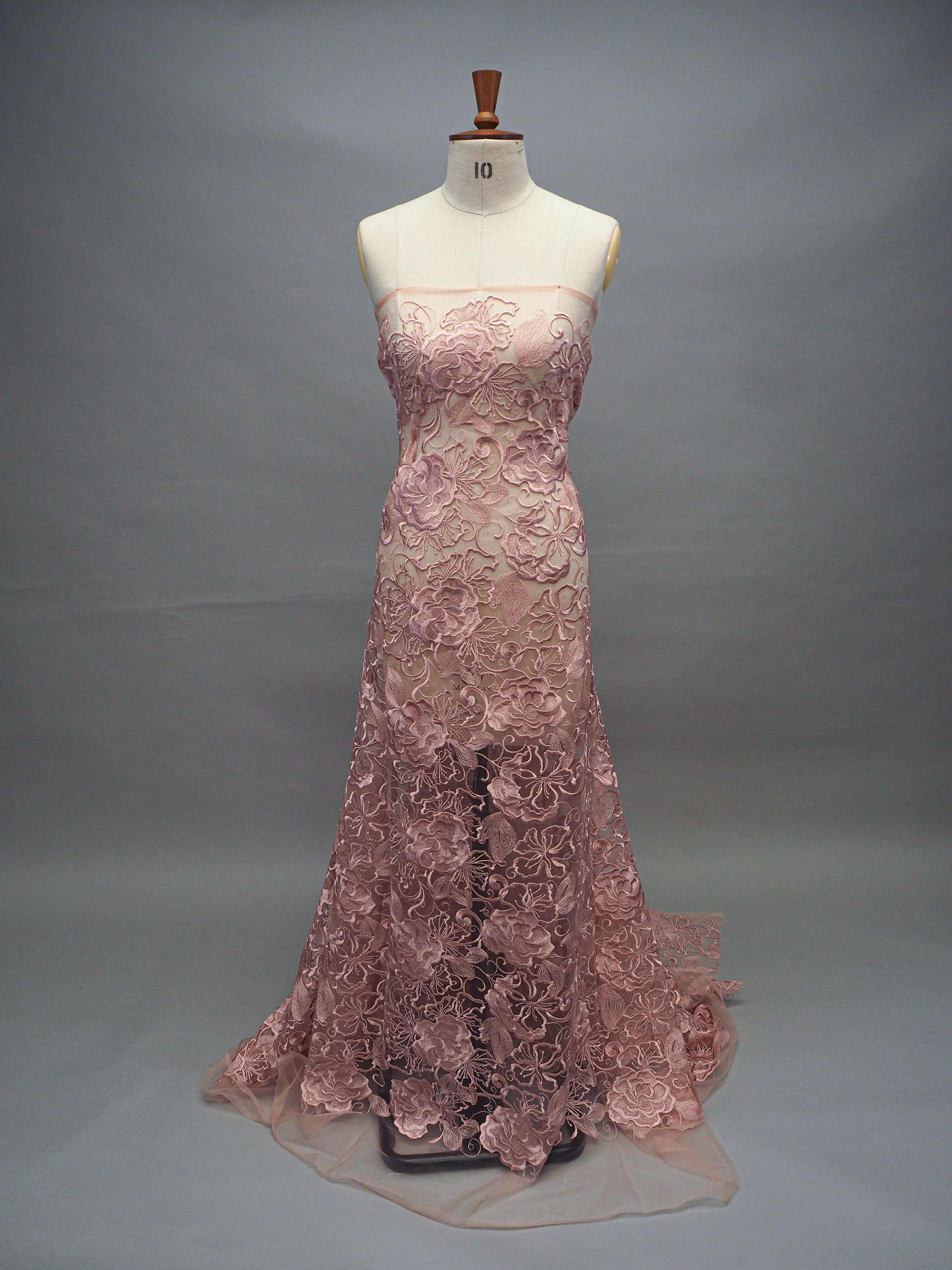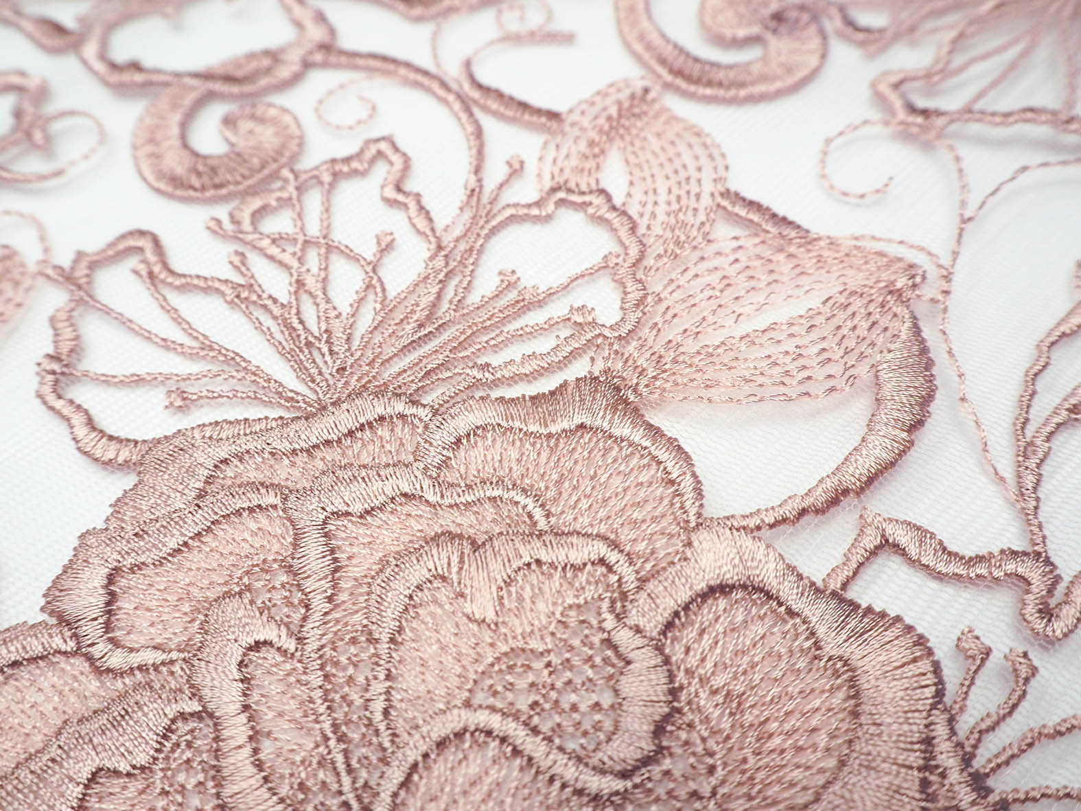 Embroidey tulle ground. Embroidered large rose and hibiscus flower with swirl details. Allover. Width 125cm
