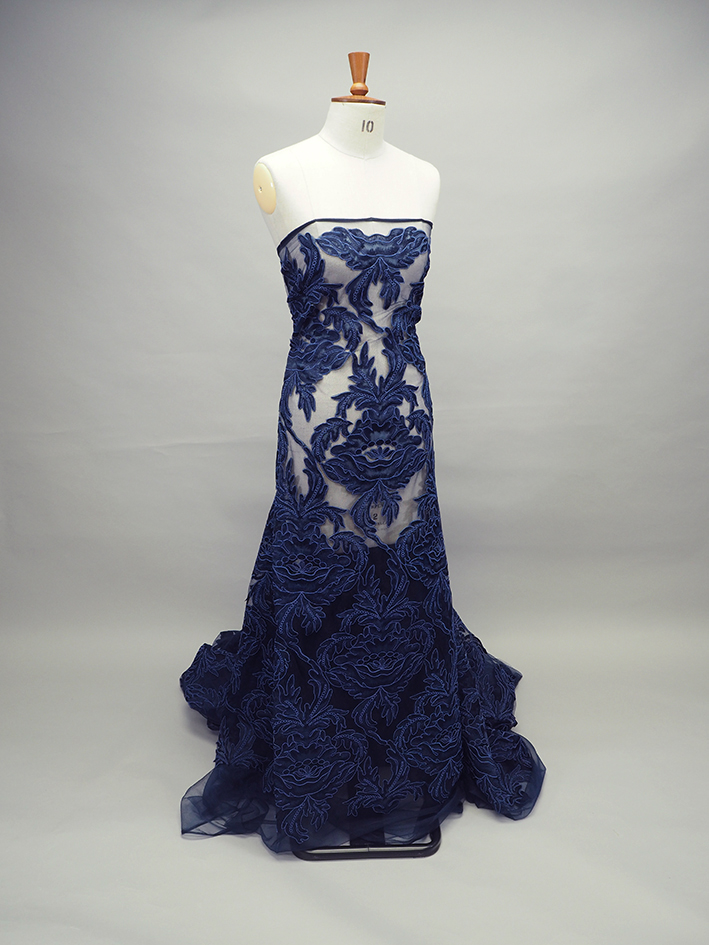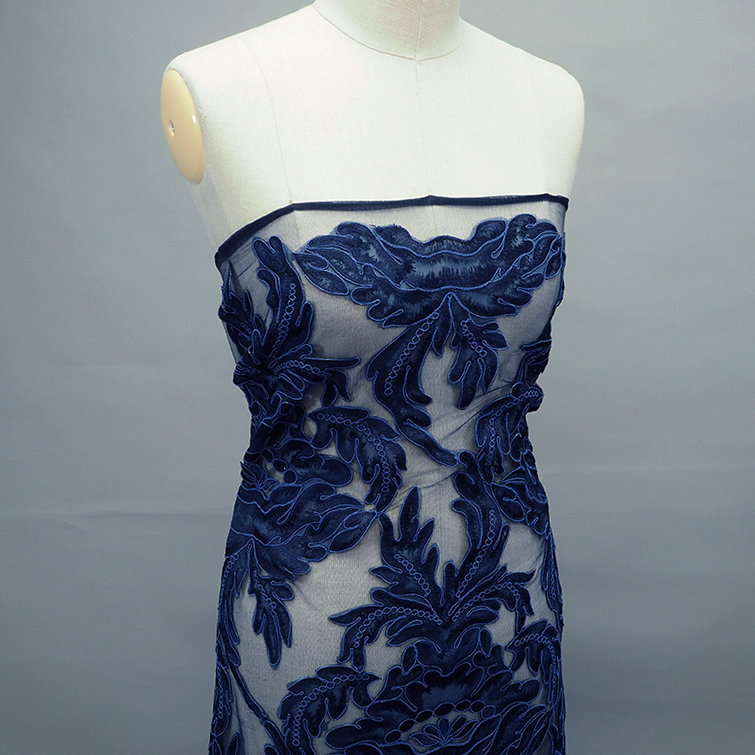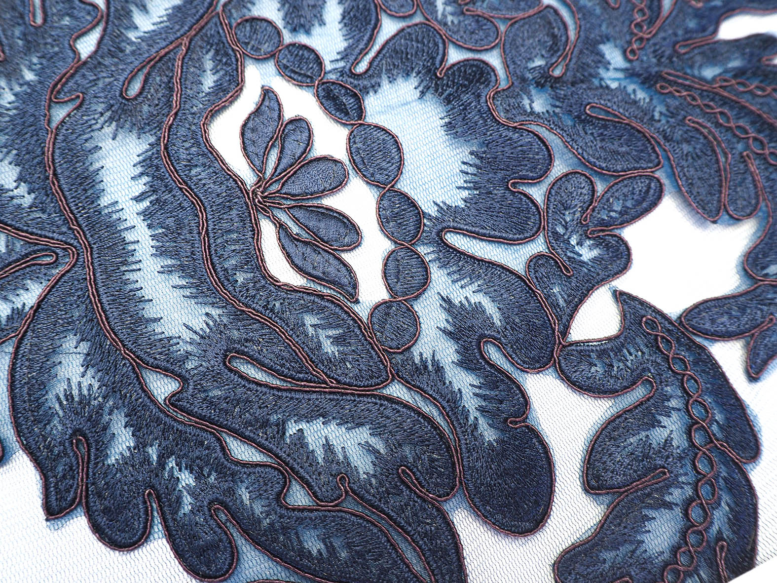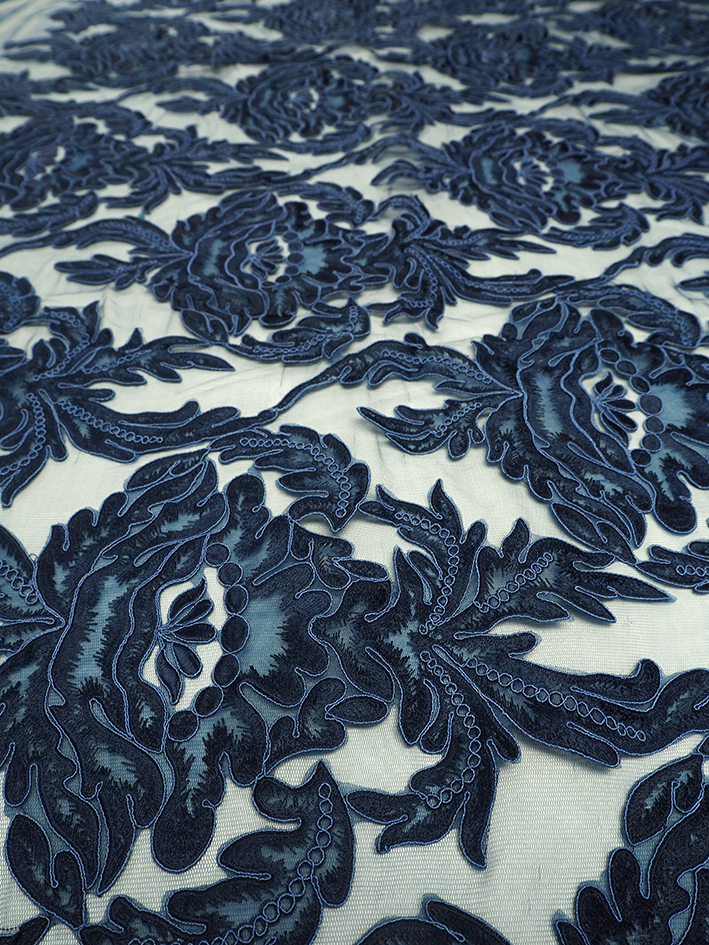 Embroidery tulle ground with damask motifs embroidery on poly organdy applicated on tulle. Allover. Width 120cm