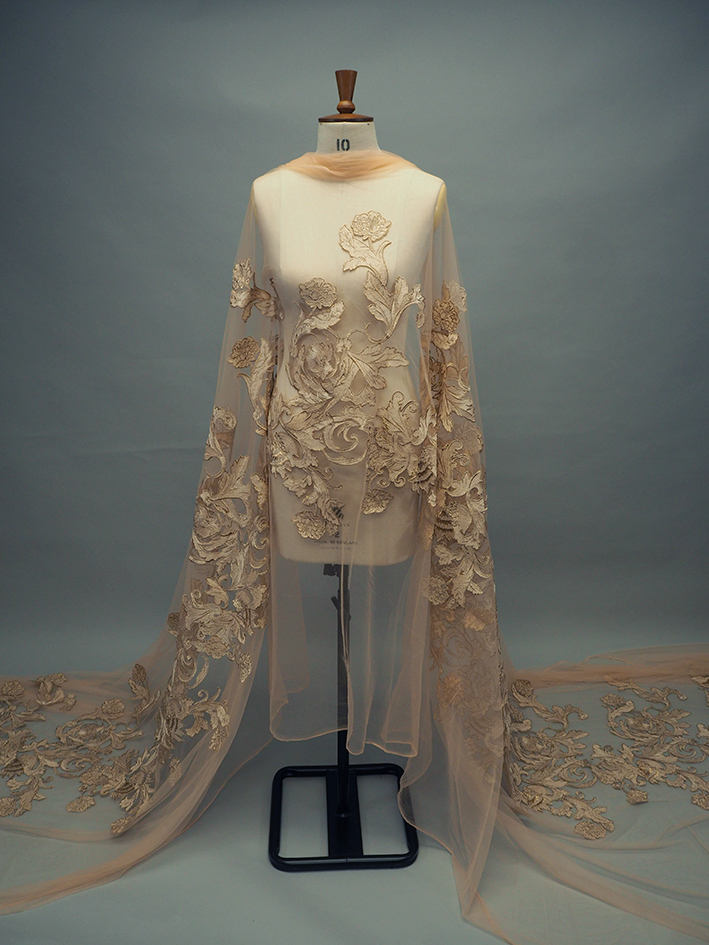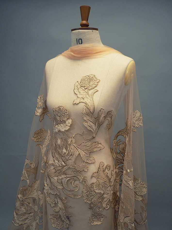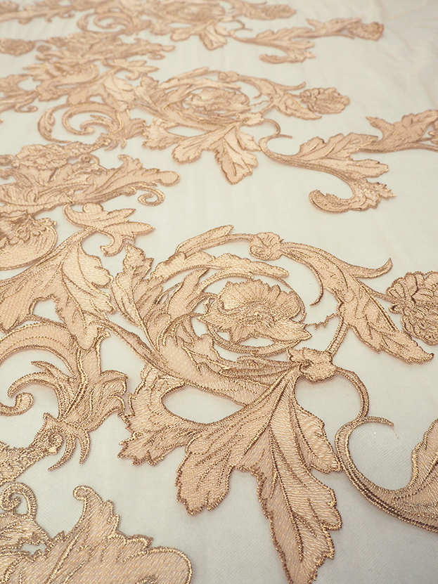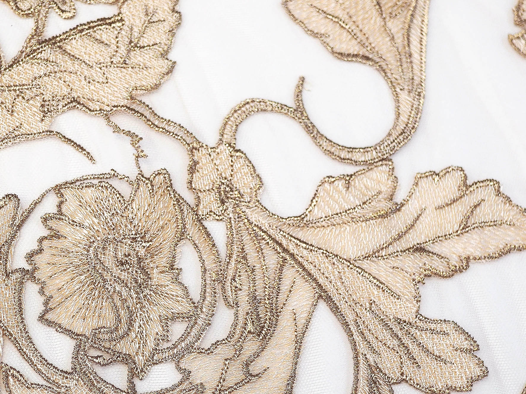 33531 Tulle ground with machine embroidery floral central band with regal scrolling central band. Width 135/140cm.