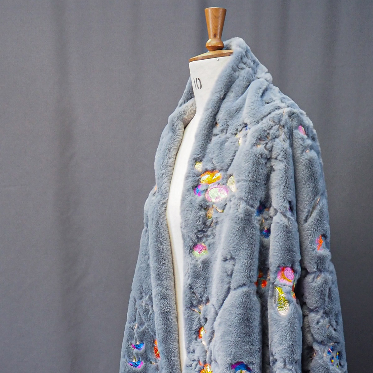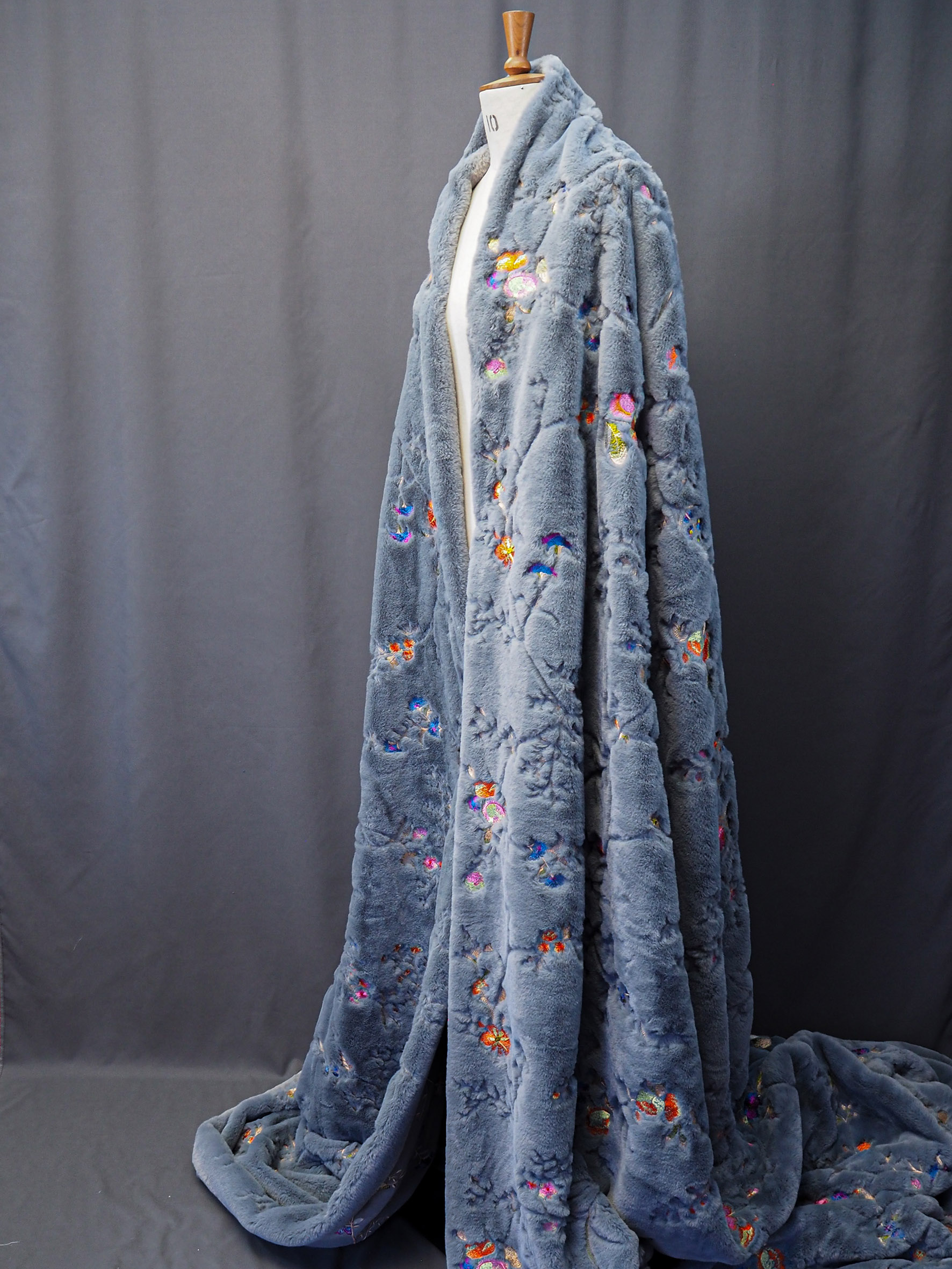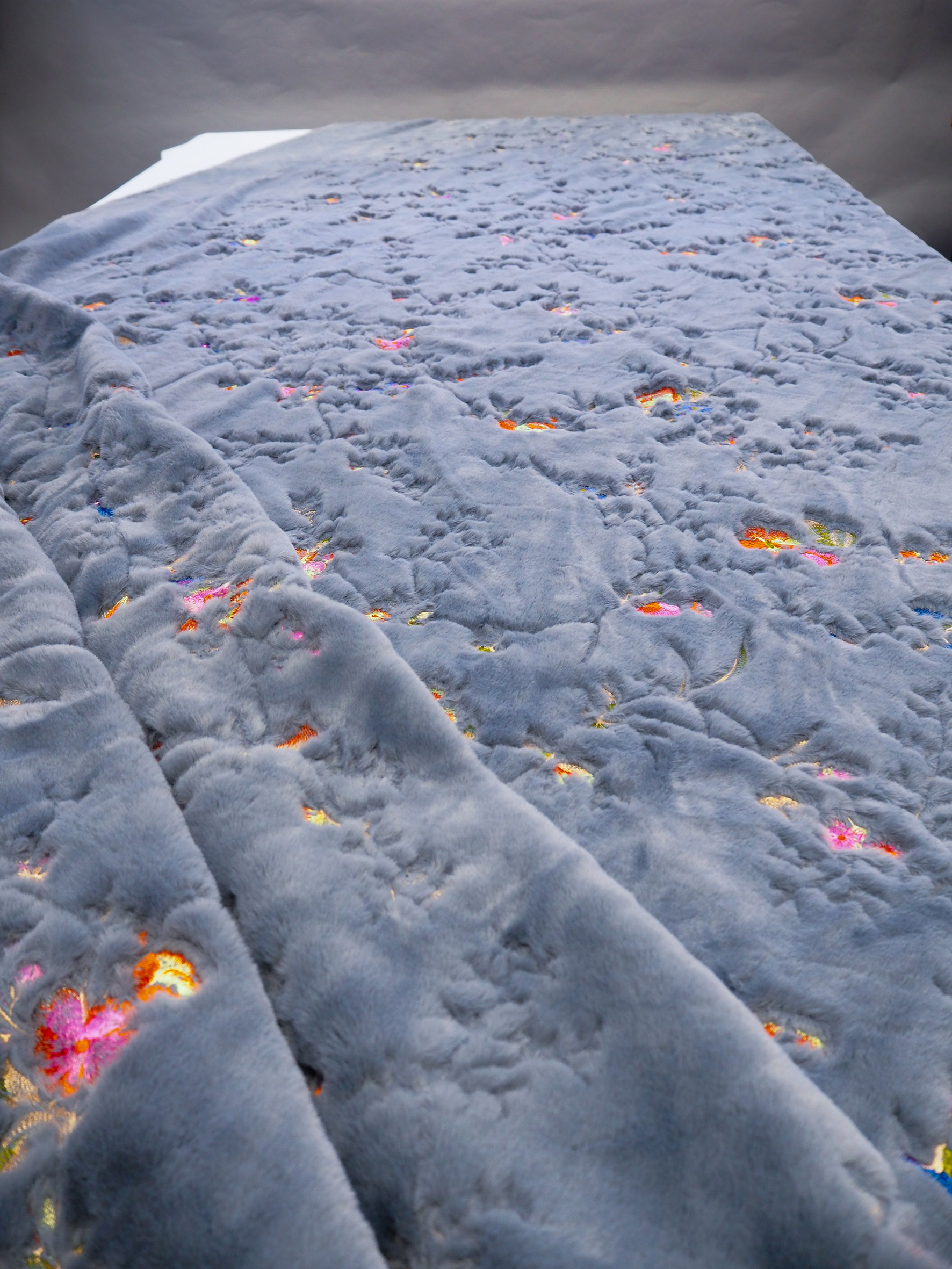 Faux fur ground. Dainty floral branches interlinking, multi colour machine embroidery, 66cm repeat, allover. Width 135/140cm
