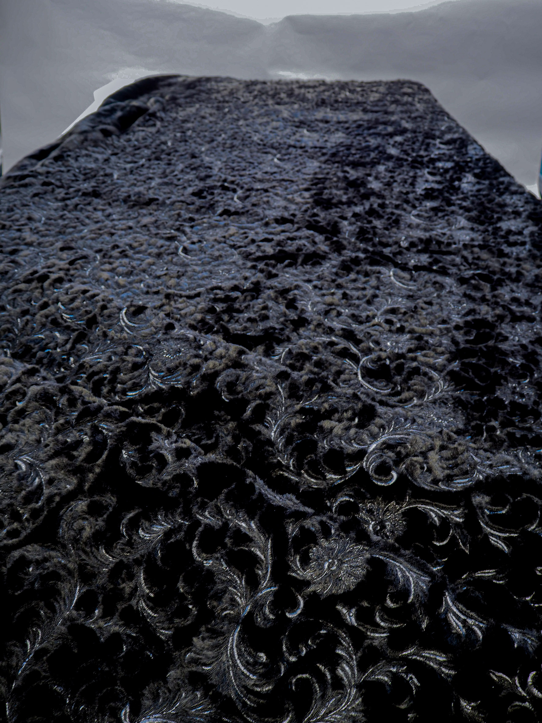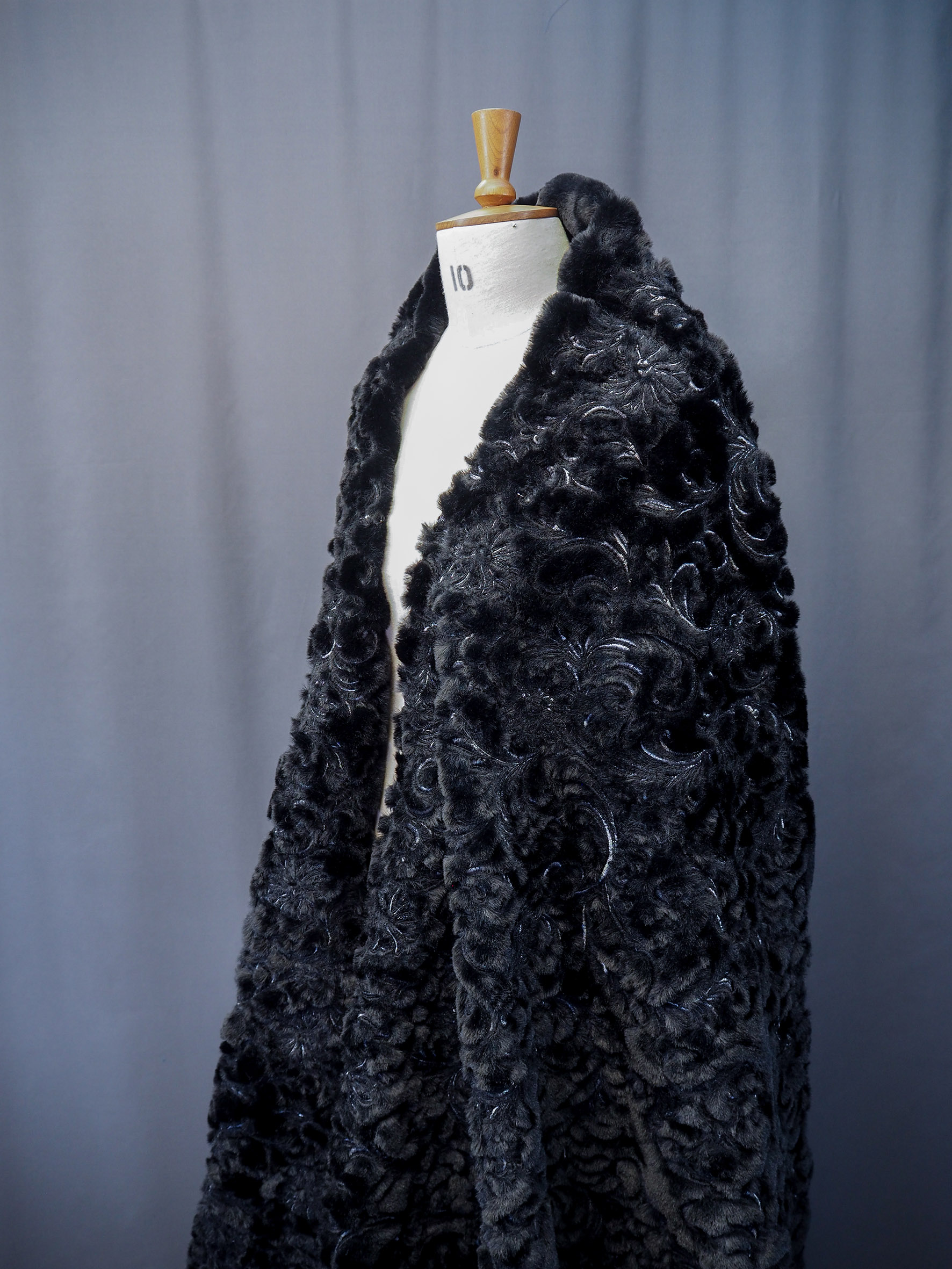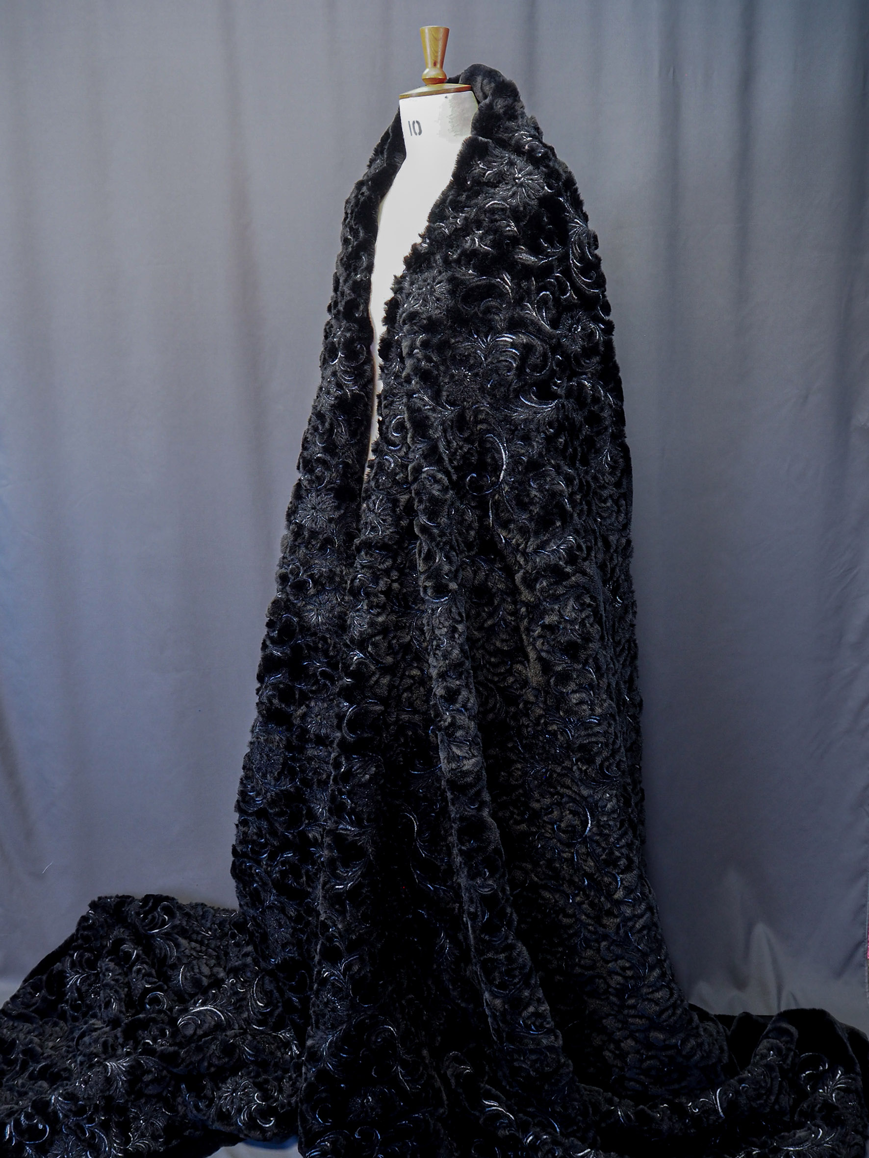 Faux Fur ground with scrolling damask embroidery allover. Width 125/130cm