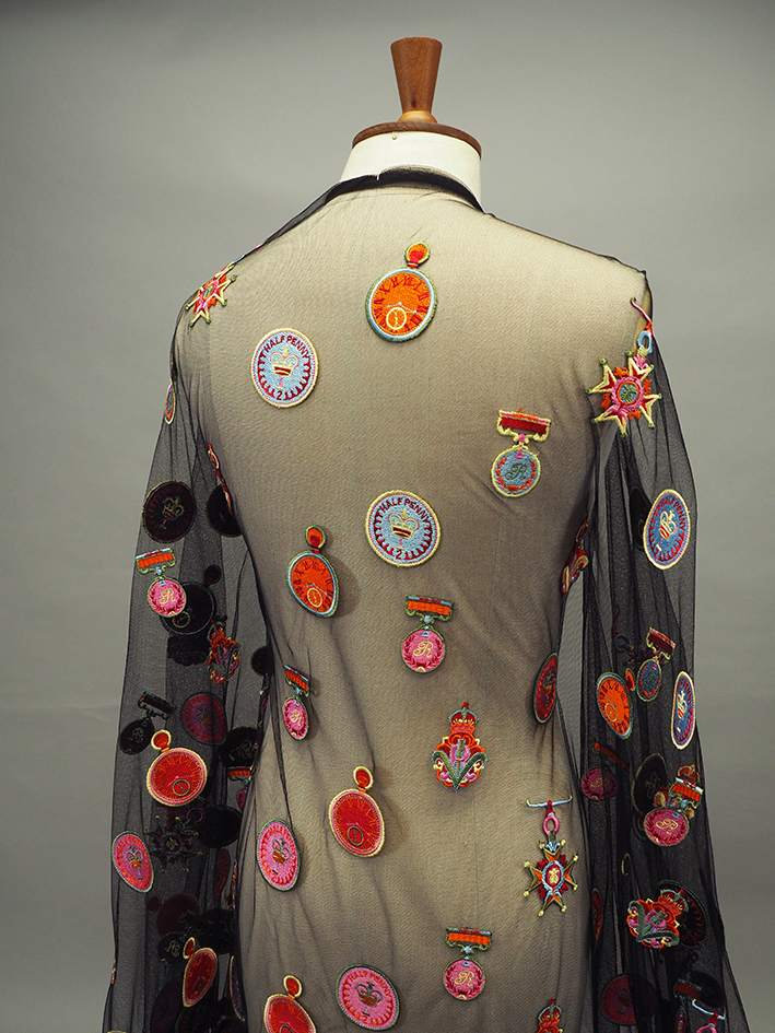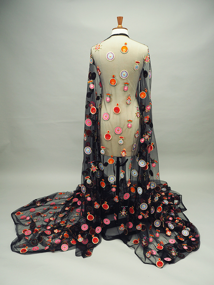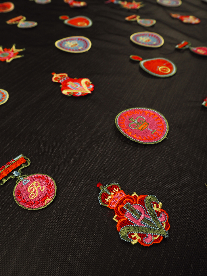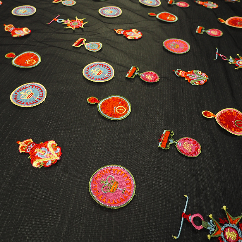 33531 tulle ground. Embroidered medals and coins, allover. Width 130/135cm Colour: Black/ Bright Multi
