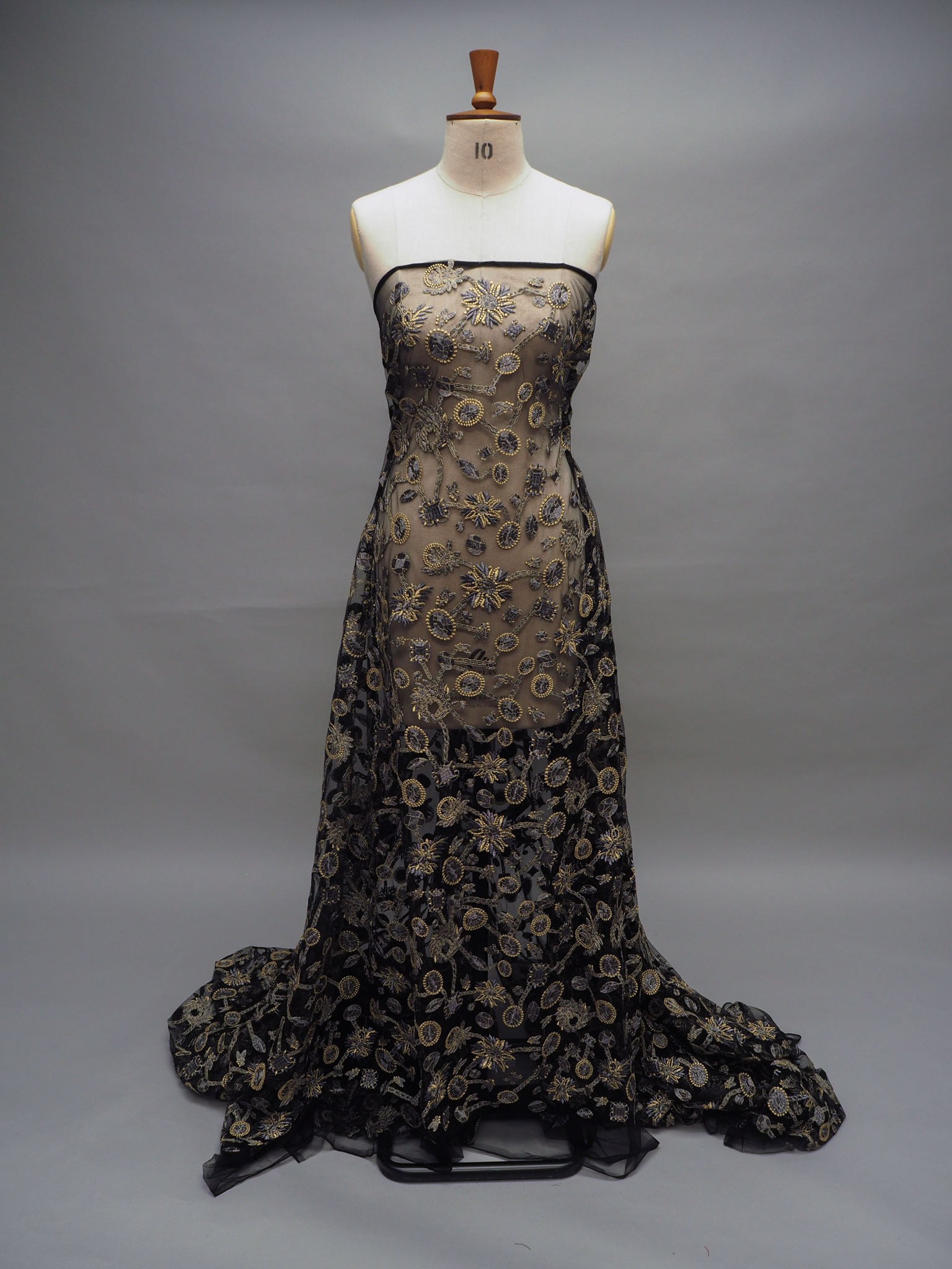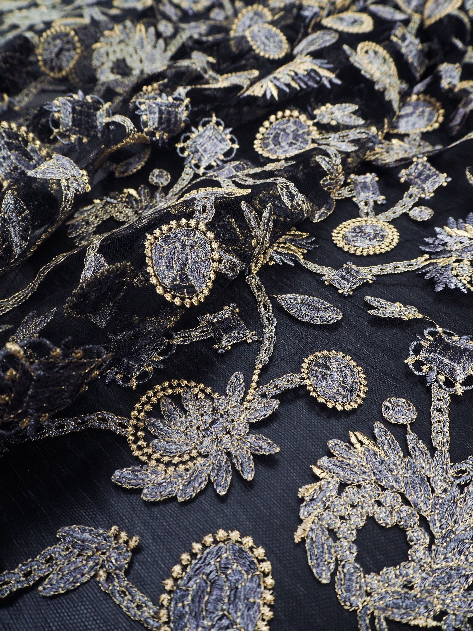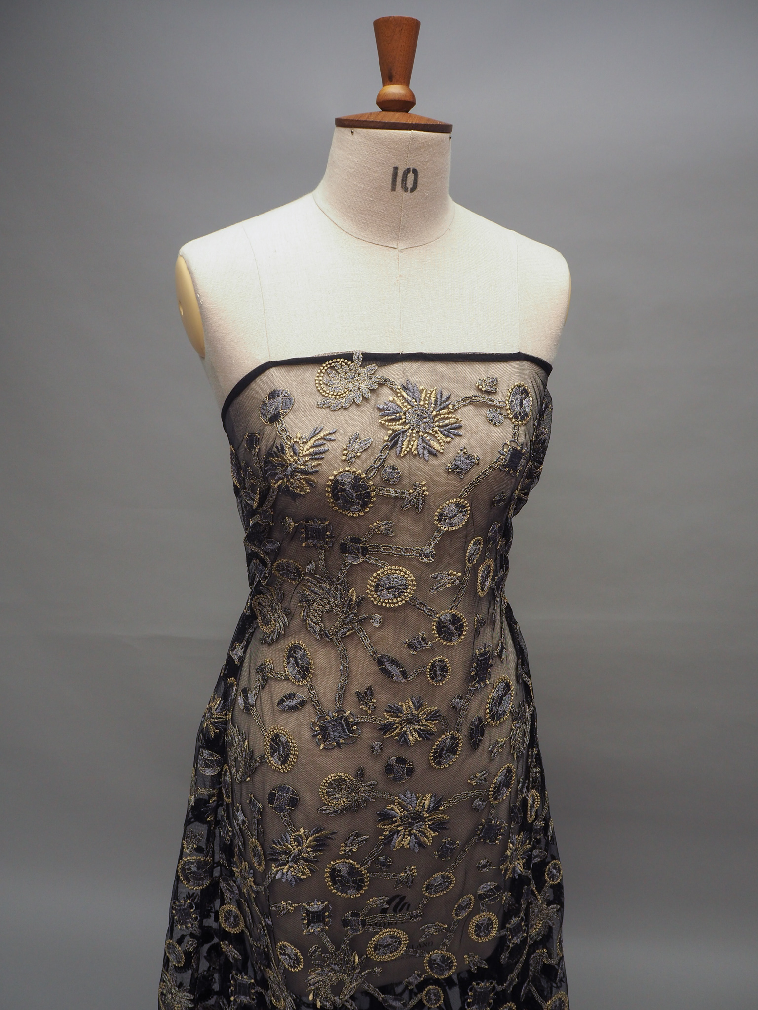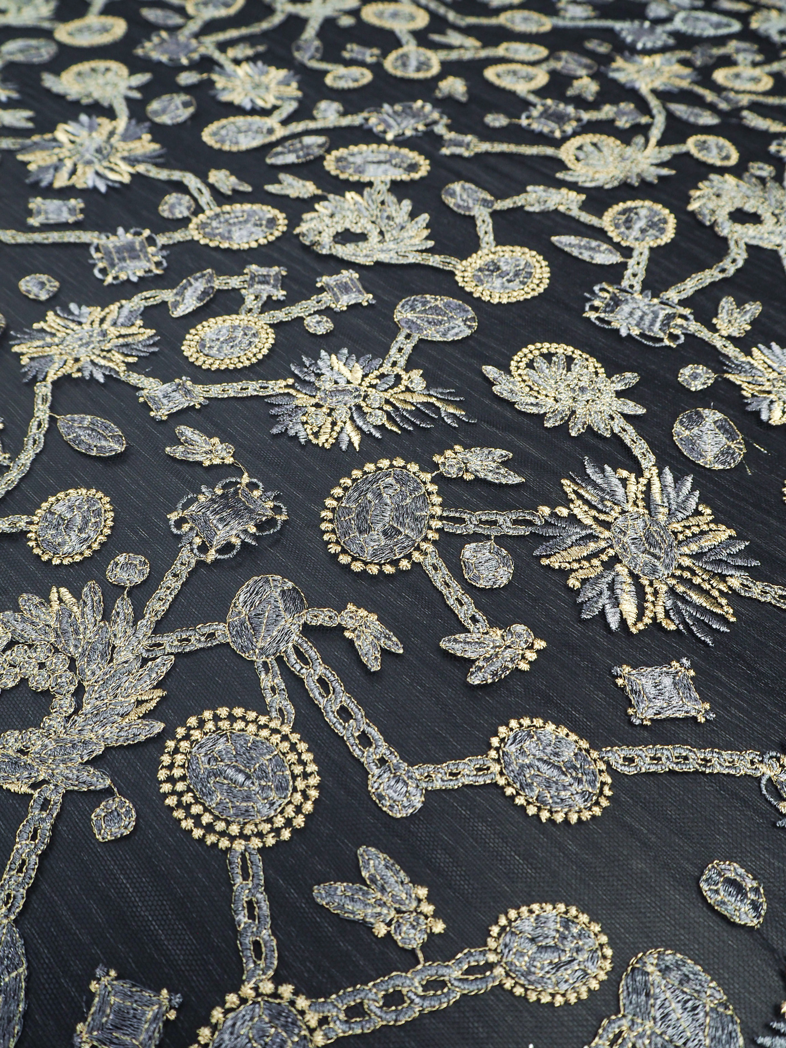 33531 tulle ground with machine embroidery of interlinking gems and chains. Machine embroidery allover. Width 125/130cm