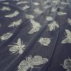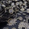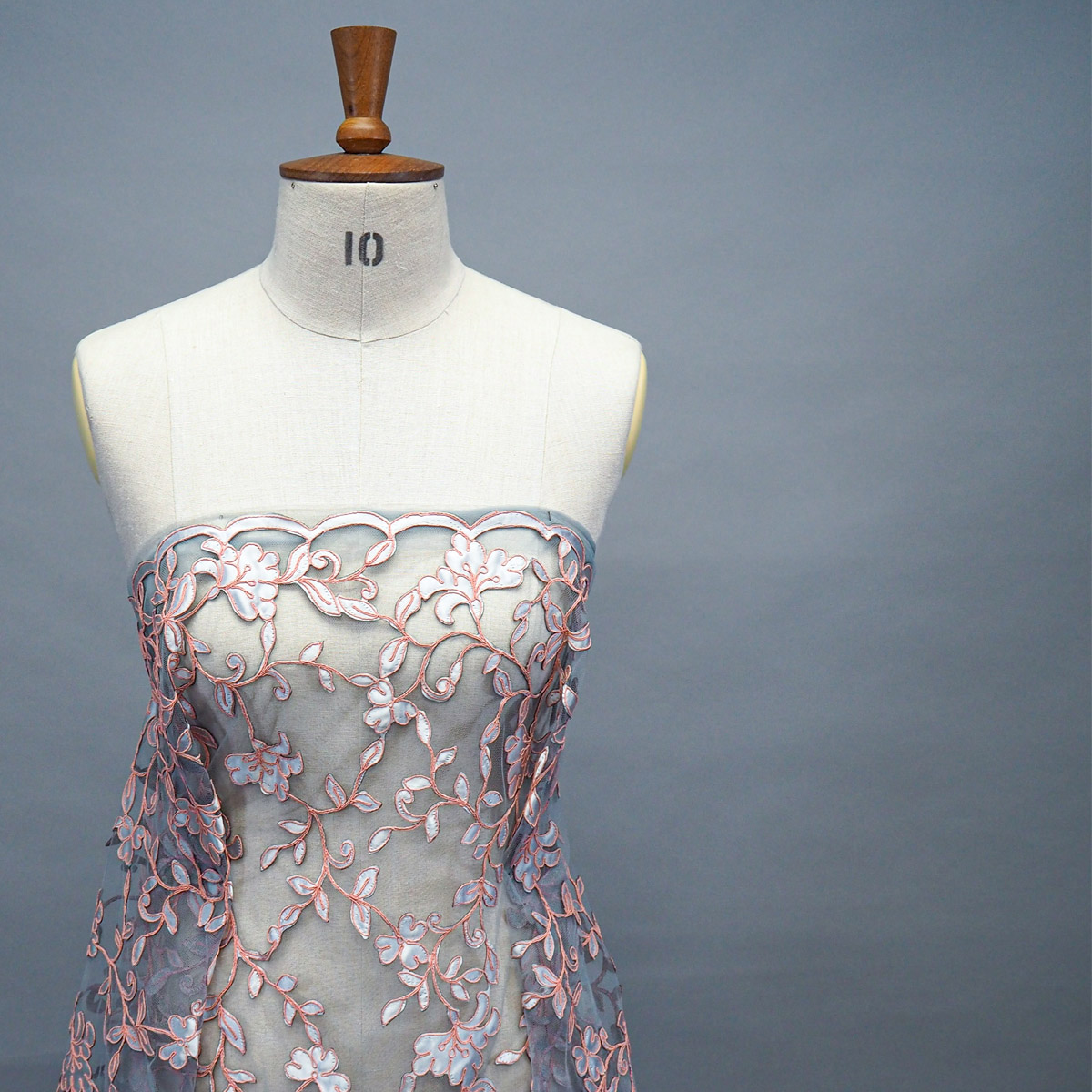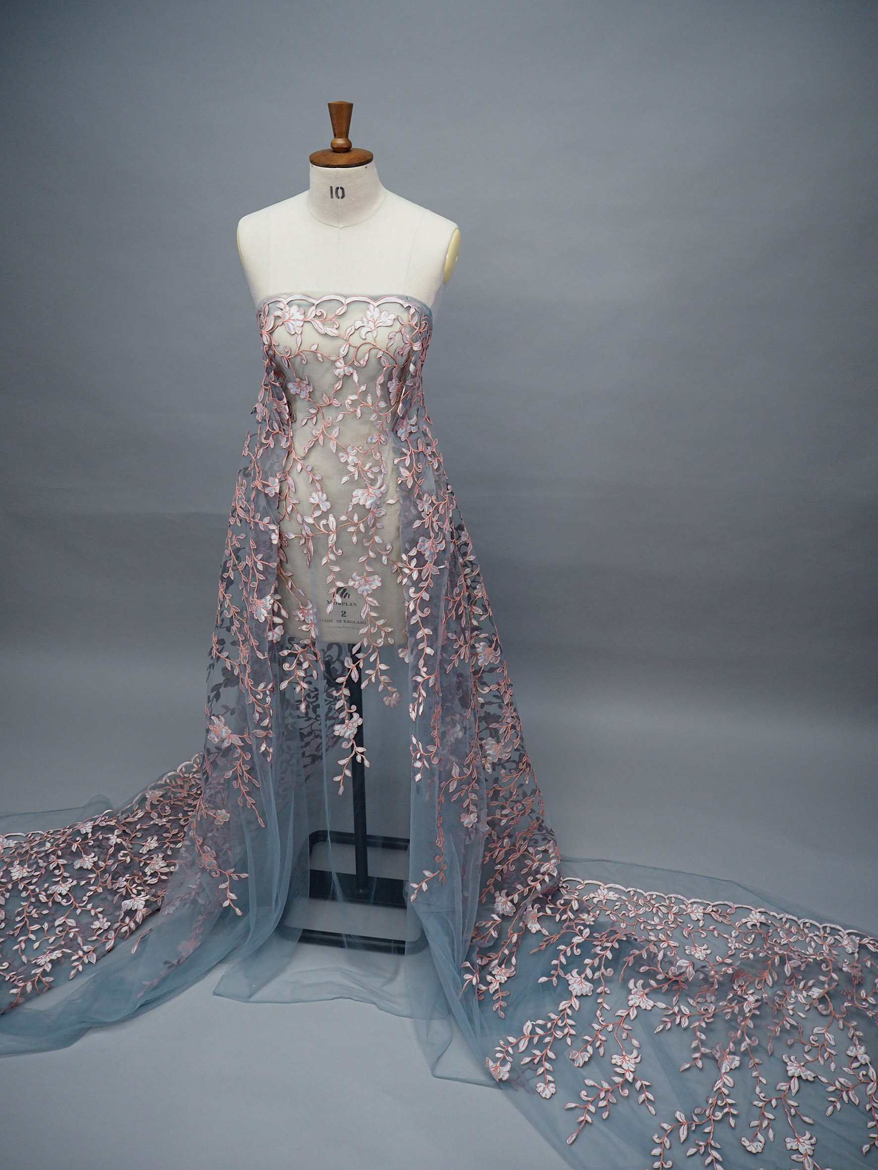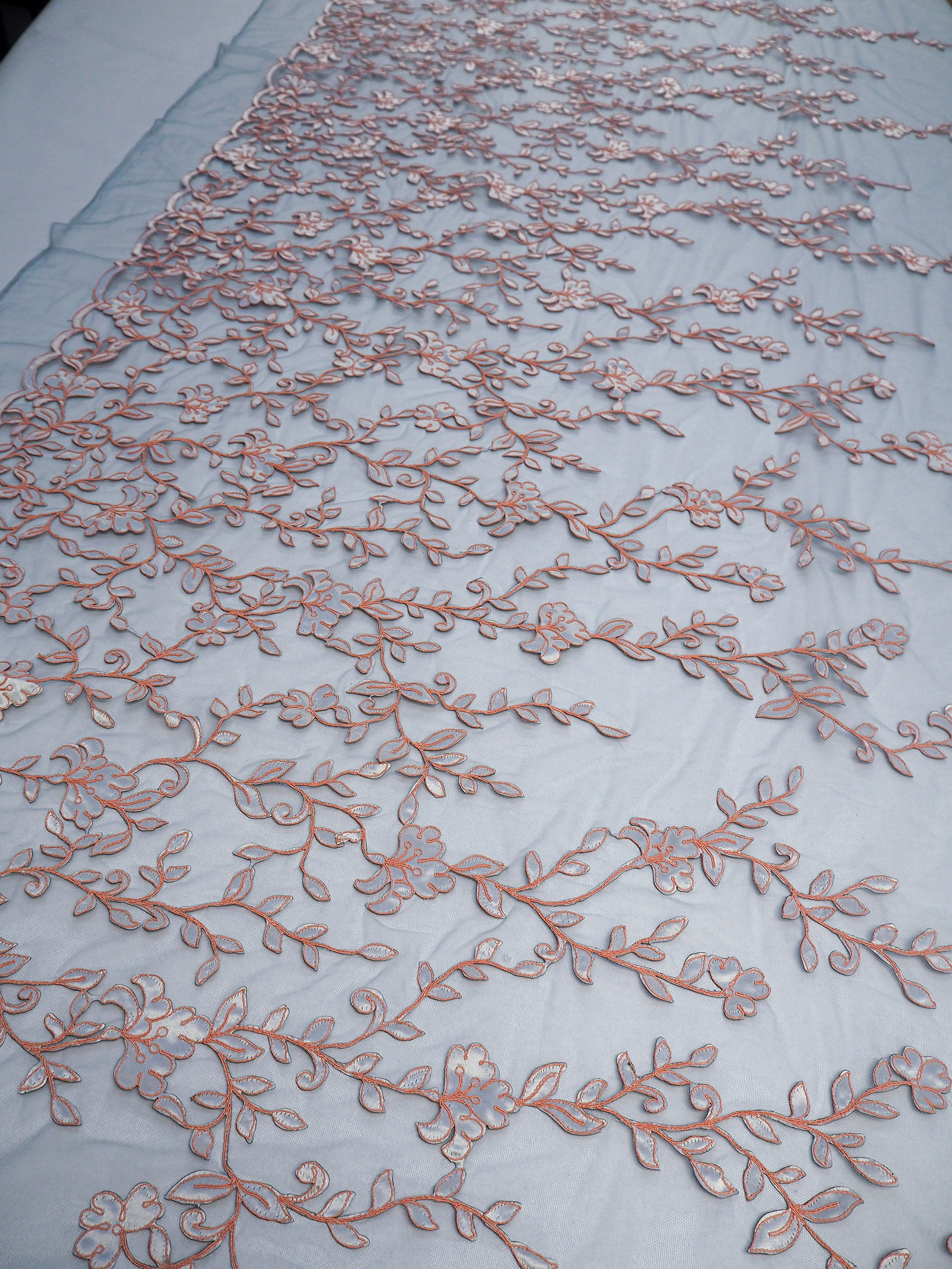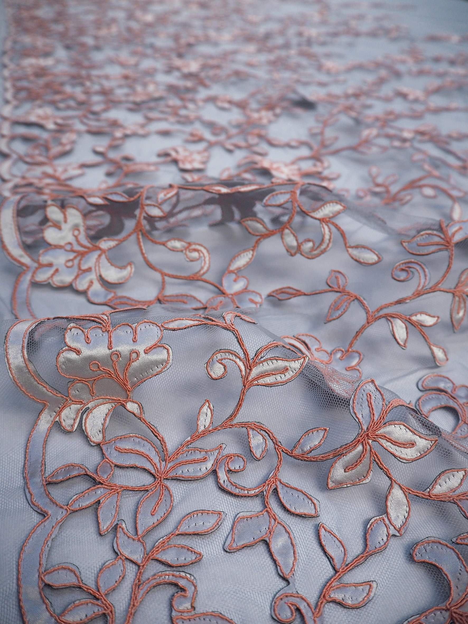 33531 tulle ground with Duchess poly satin heat cut and cord. Climbing carnation florals with one sided scalloped edge. Continuous border. Width 145cm