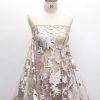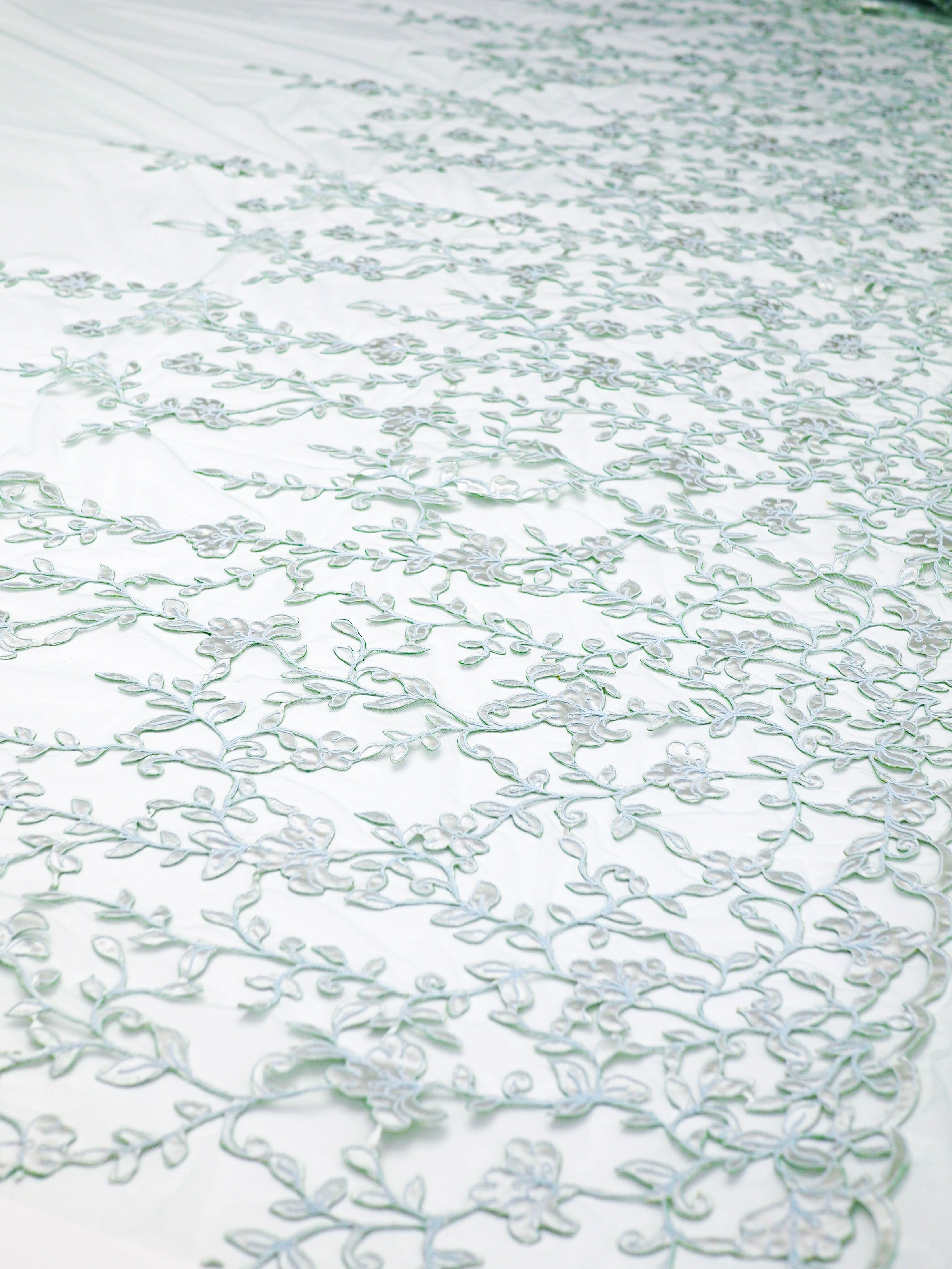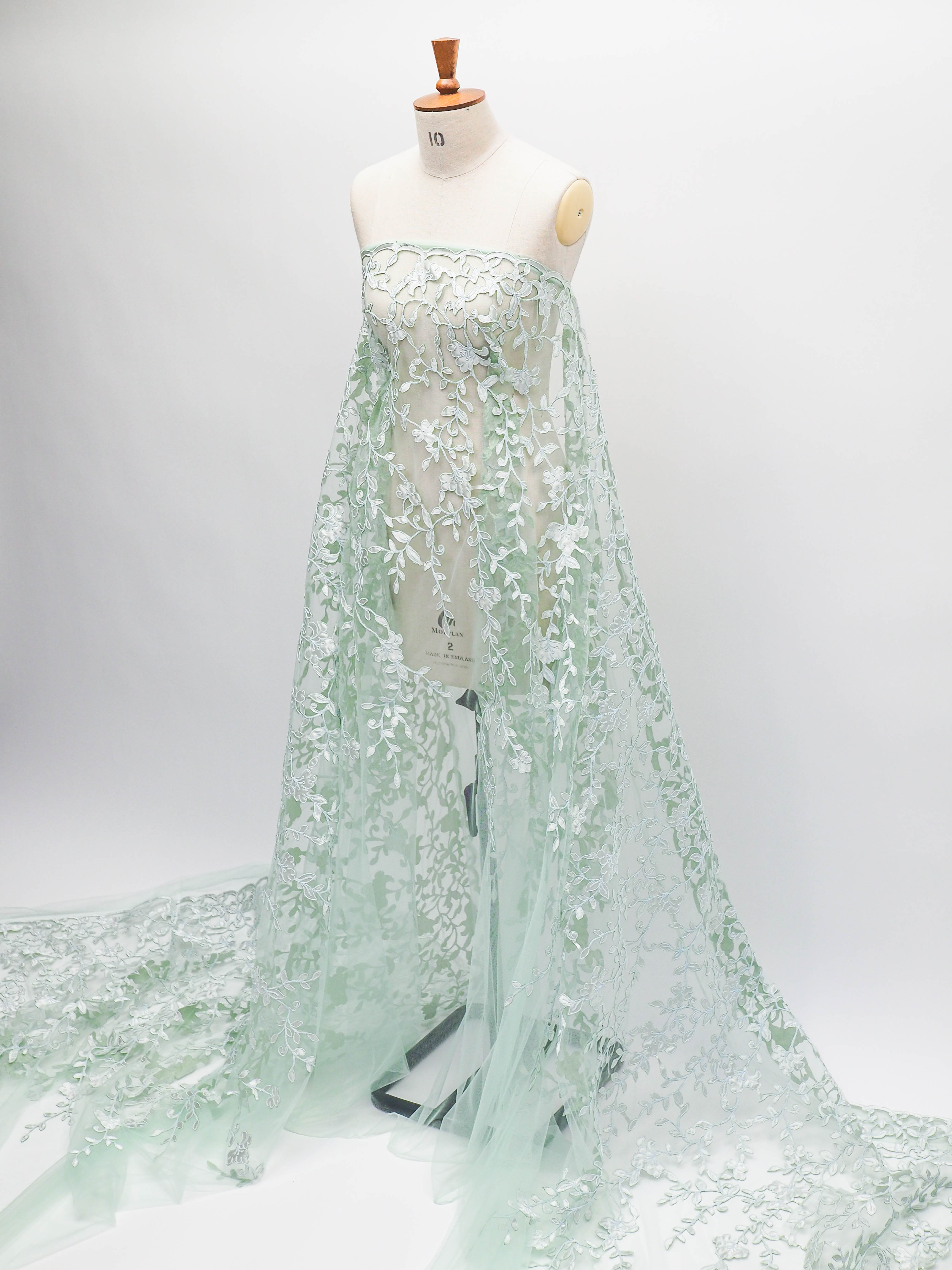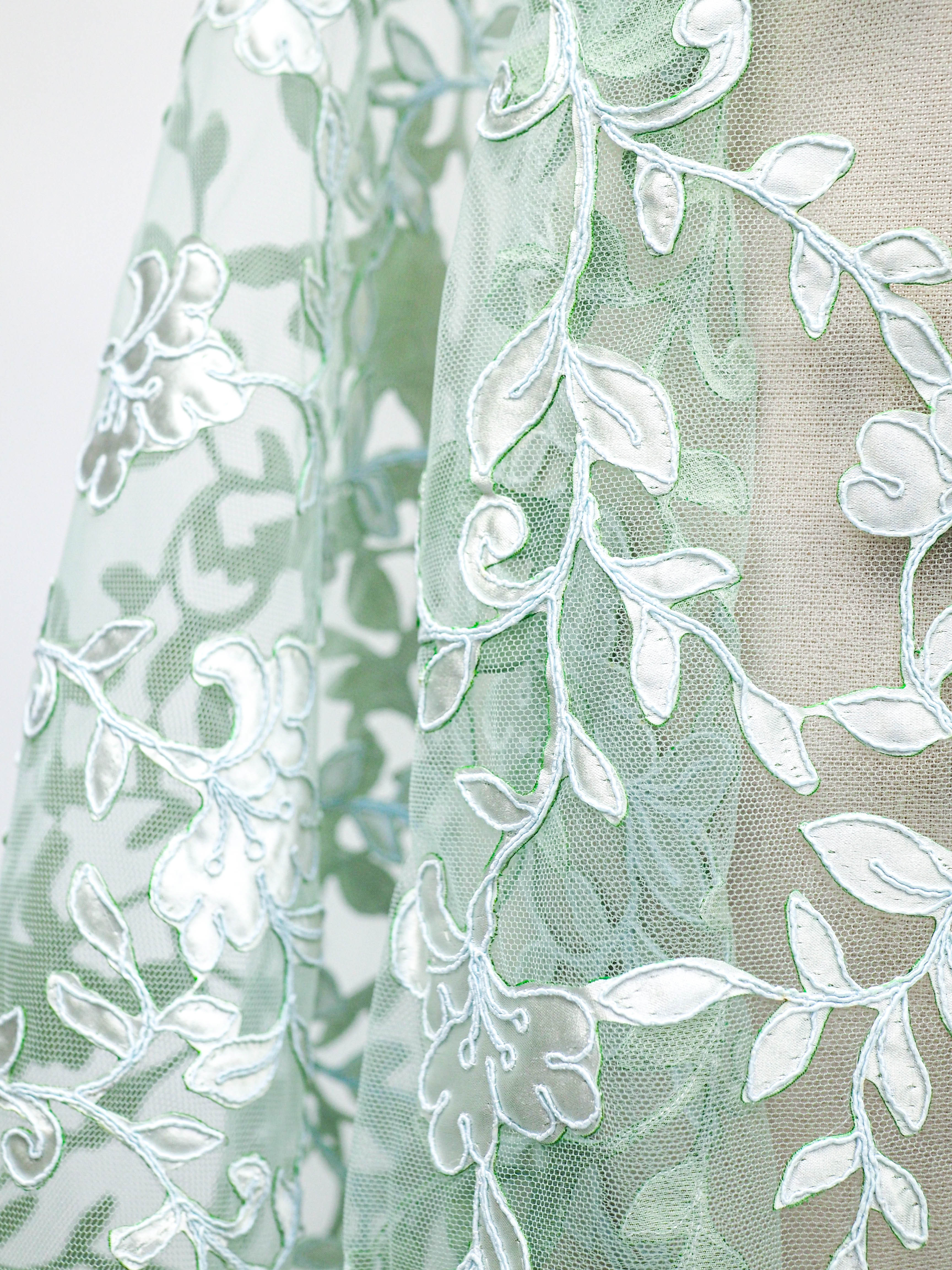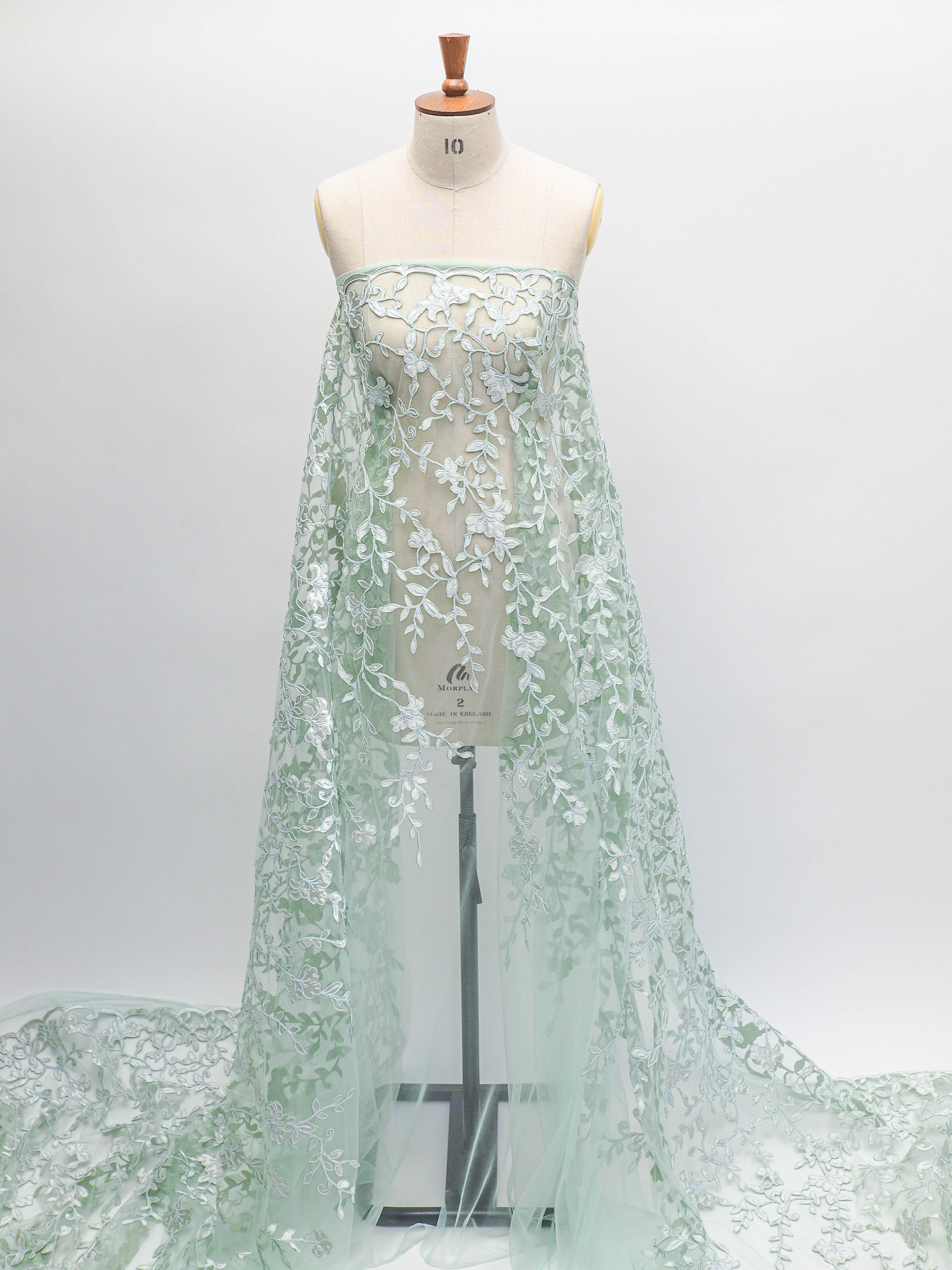 33531 tulle ground with Duchess poly satin heat cut and cord. Climbing carnation florals with one sided scalloped edge. Continuous border. Width 145cm